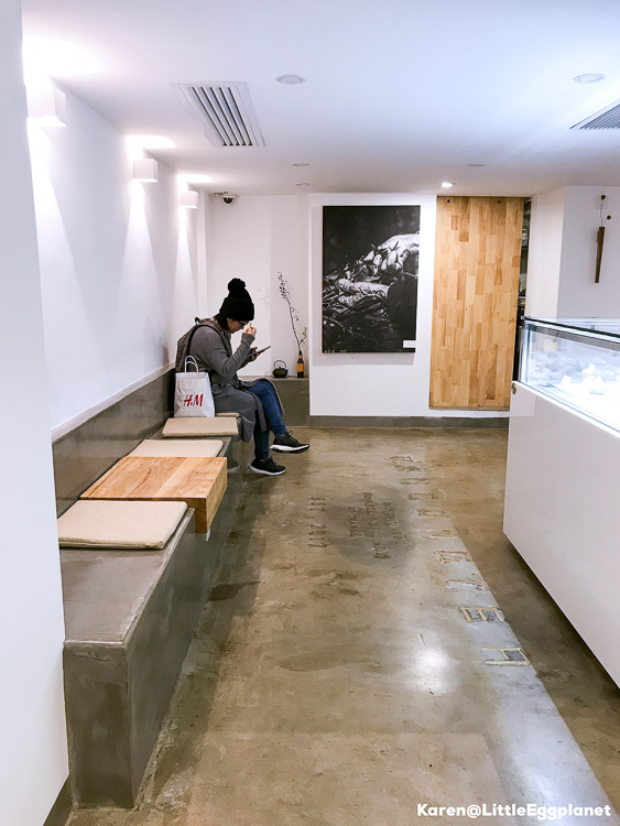 ▼山芝慕斯(¥26):山岩形狀的抹茶黑芝麻慕絲蛋糕,外面是漸變灰色,做得很精緻,味道亦不錯、天然,不會太甜或太苦,也吃不出有抹茶香精味。不過慕絲算不上很軟滑(大概是要兼顧塑形的關係),但合格有餘。上碟的時候,盛載蛋糕的石質碟是冷凍過的,能看出他們的細心。