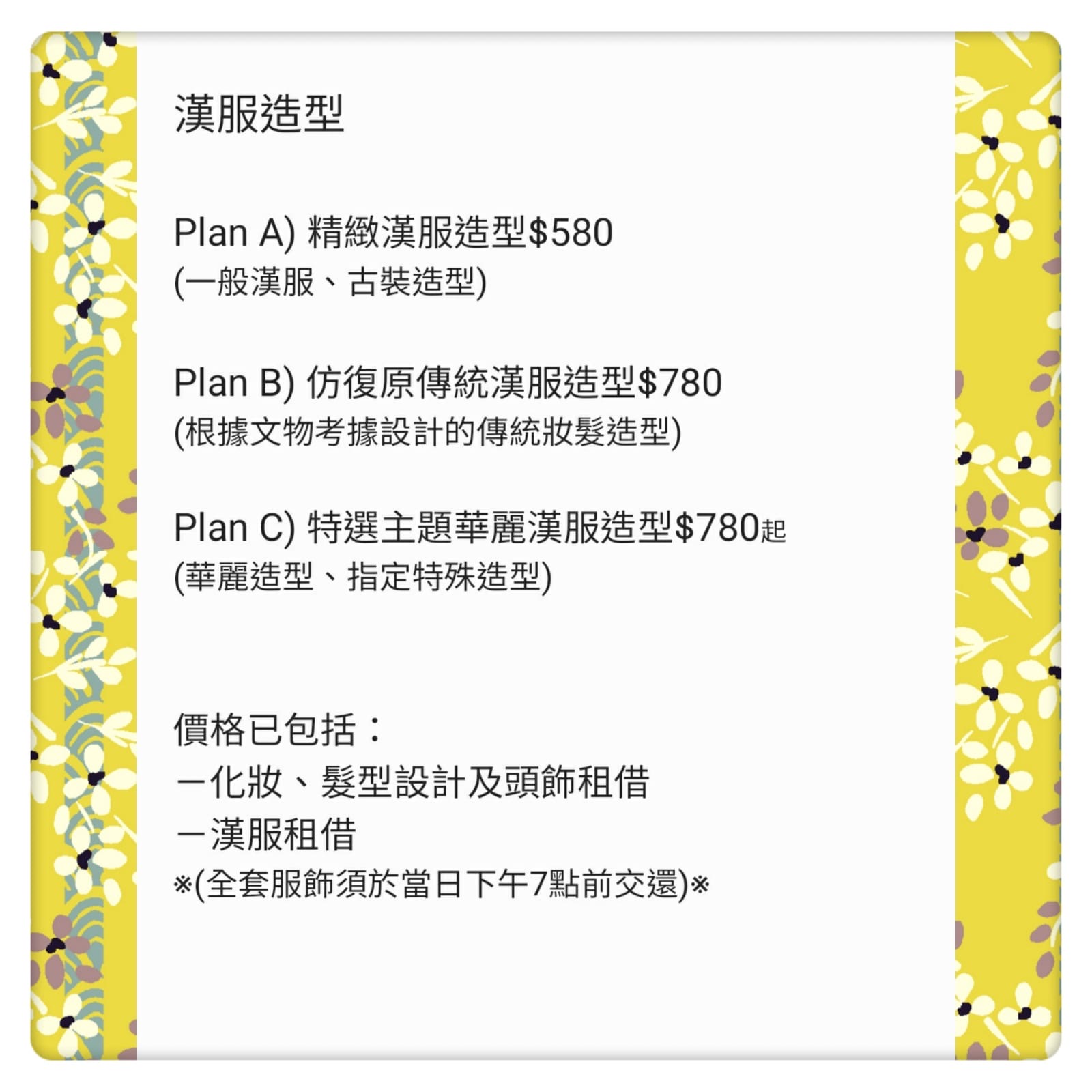 漢服體驗一條龍服務價目表(包含漢服租借、造型、化妝、攝影):