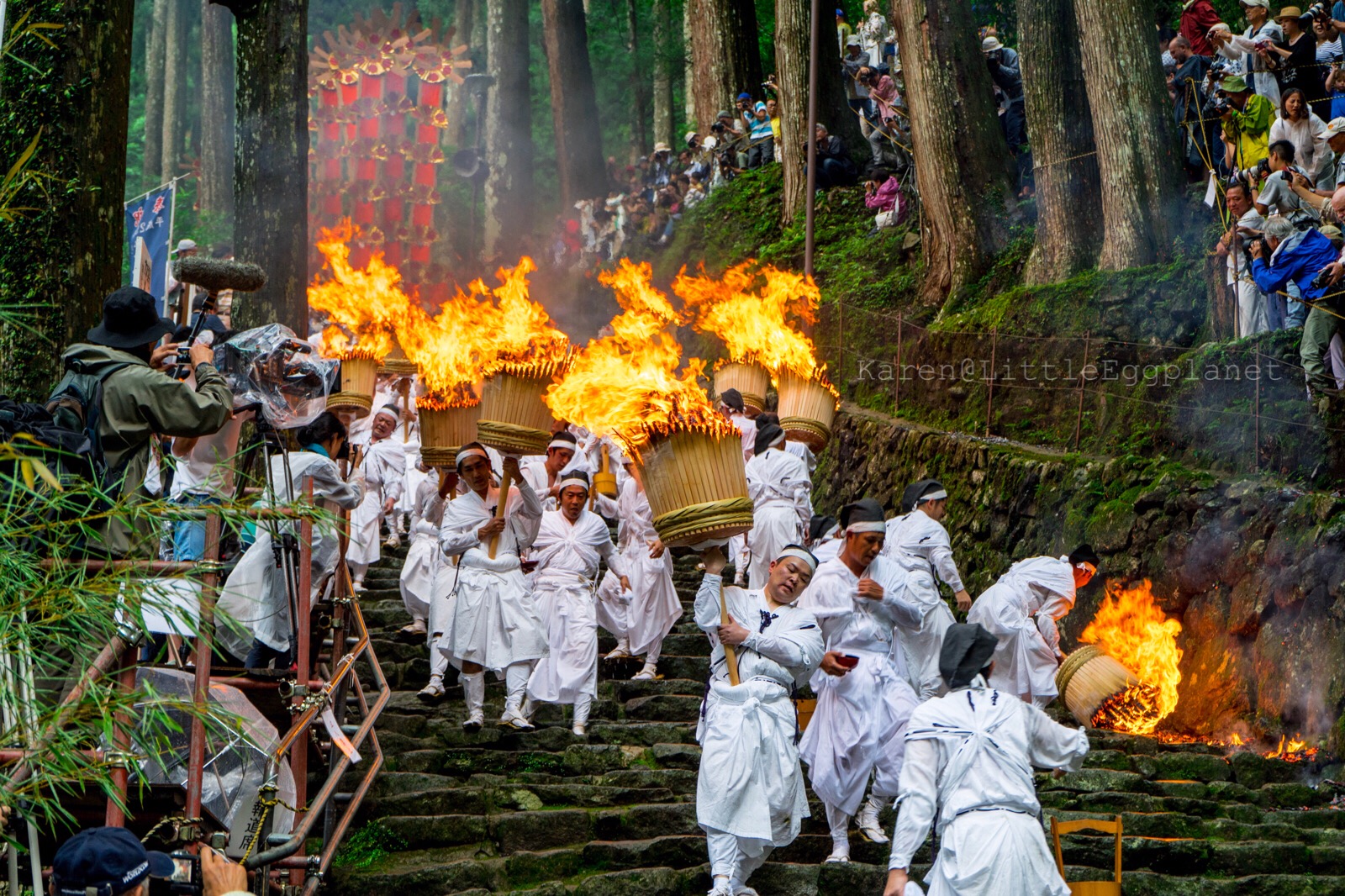 我到達的時間還早,當時只是隨隨便便找個空間待著,而最後卻還真的站了在前排的位置,與祭典隊伍只有僅僅幾米的距離,點火時還能感受到火把的熱力,還可以摸摸火把(看其他日本人這樣做我也跟著做哈哈)。