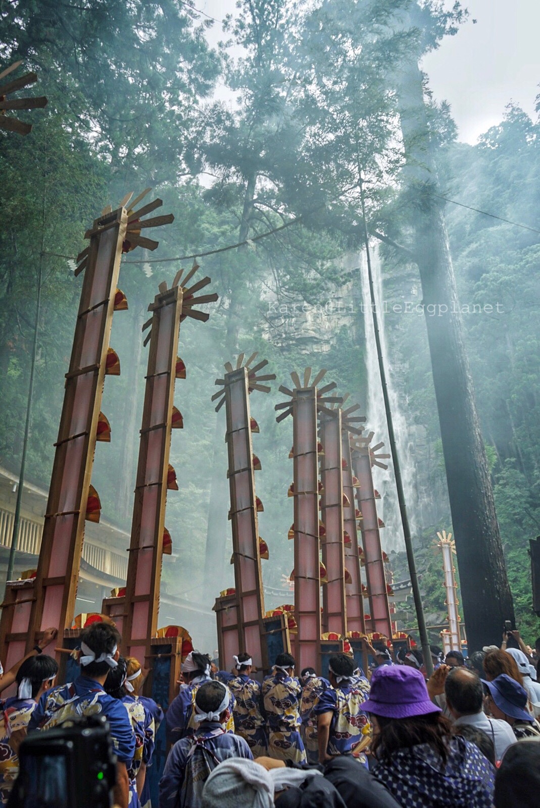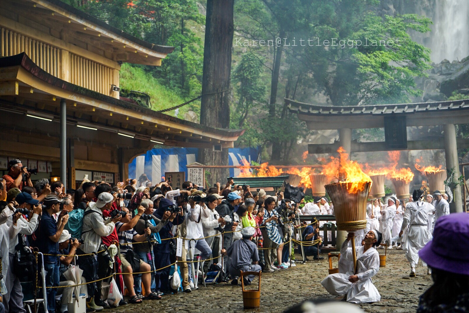 祭典的各個環節於不同的場地舉行,各場地之間相距不遠,但當中的重頭戲「御火行事」則位於飛瀧神社(那智の滝)(地圖上的venue 2),14:00開始。事前參考過別人的攻略,所以決定提早到達現場佔個有利位置。