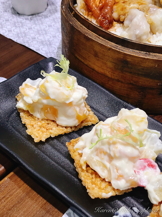 ▼鍋巴什果沙律($28):不推介,完全沒有鍋巴那種略黏牙的口感,只是一塊炸得脆脆、吃起來很上火的東西。而脆餅上沙律的味道,明顯是那種不經調味的現成沙律醬造的,過於甜膩。