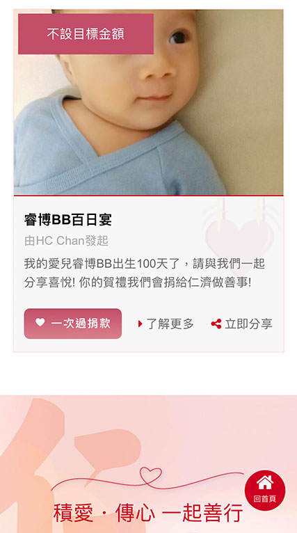 仁濟醫院的「積愛‧傳心籌款」網頁並不局限於喜慶宴會,生日會、婚禮、彌月、百日宴、店舖開幕、周年誌慶、弔唁……等等可能有賓客打算送上祝福的活動,皆可以建立籌款頁面,發起慈善捐款。